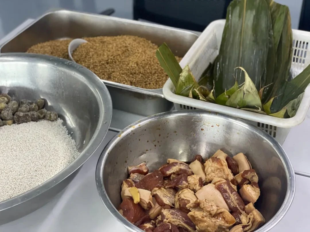 活动现场,颗粒饱满的糯米、肥瘦相间的猪肉、蜜枣、粽叶等原材料整齐地摆放在桌子上,职工们摩拳擦掌、跃跃欲试,场面十分热闹。