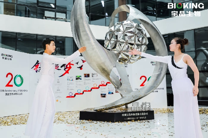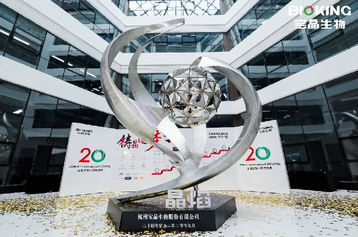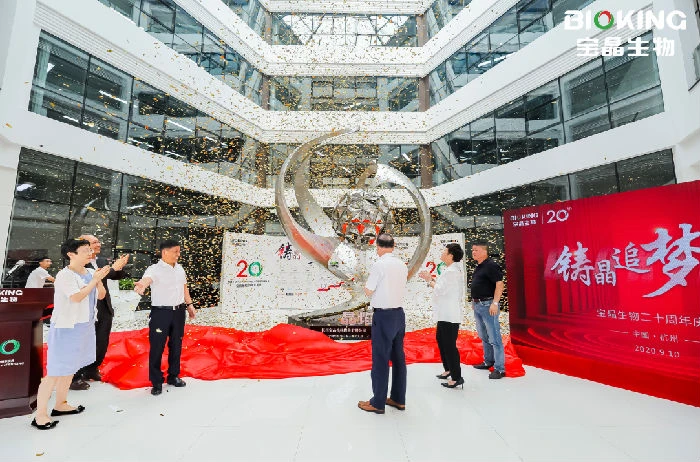 二十年,为了纪念这个历史时刻,6686体育官网生物和浙江美院的学子合作设计创作了一座艺术雕塑,并由董事长张建国先生亲自命名为“晶焰”,6686体育官网的晶,火焰的焰,寓意6686体育官网具有不熄火焰般的生命力与创造力!它同时也展示出6686体育官网的企业文化“创新为源、诚信为本、责任为先、卓越为志”。现场由“浙江省商务厅二级巡视员韩洪祥、韩厅长,浙江省商务厅贸易救济局局长朱颖、朱局长,余杭区商务局局长赵杏文、赵局长,塘栖镇镇长郭欣玮、郭镇长、锦天城律师事务所合伙人傅东辉大律师、以及6686体育官网生物董事长张建国先生”六位揭幕嘉宾揭开了“晶焰”的神秘面纱。
