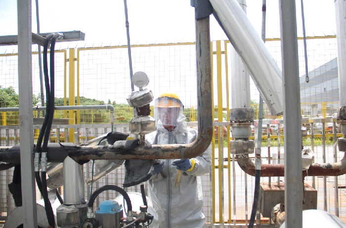 危化品泄漏应急处理小组立即出动(穿着化学防护服,防护眼镜)采取措施,利用雾状水对泄漏区域物料进行不断稀释,立即通知维修对储罐出口阀进行手动关闭,同时对空气中氧气浓度不断进行检测,确保不超标。