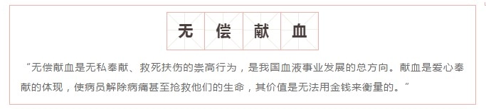 “无偿献血是无私奉献、救死扶伤的崇高行为,是我国血液事业发展的总方向。献血是爱心奉献的体现,使病员解除病痛甚至抢救他们的生命,其价值是无法用金钱来衡量的。”