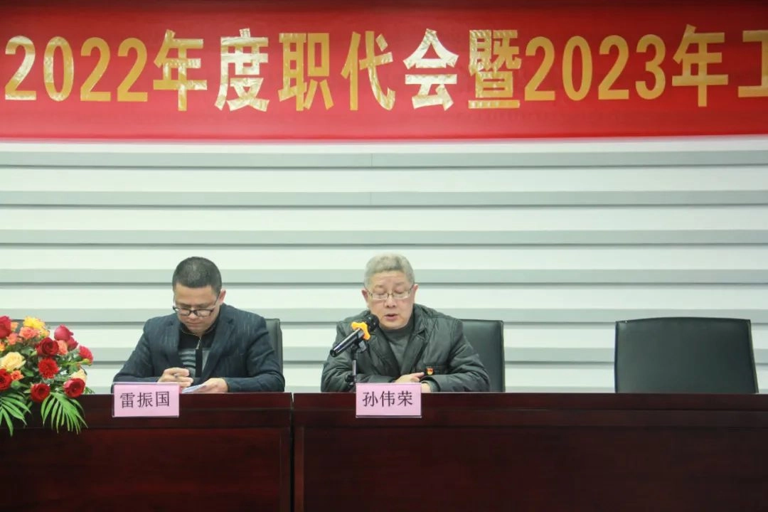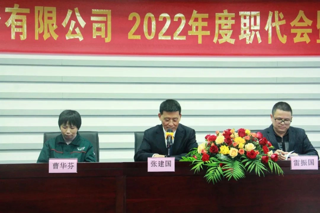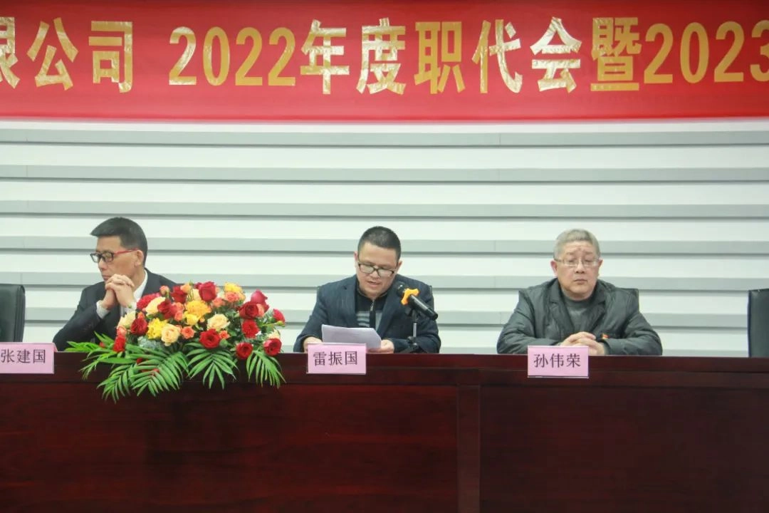 会议由工会主席雷振国同志主持。首先,会议选举孙伟荣、张建国、陈铭、曹华芬、雷振国为主席团成员,并由张建国总经理做出《2022年工作总结暨2023年工作任务》的报告。(根据笔画顺序排序)。